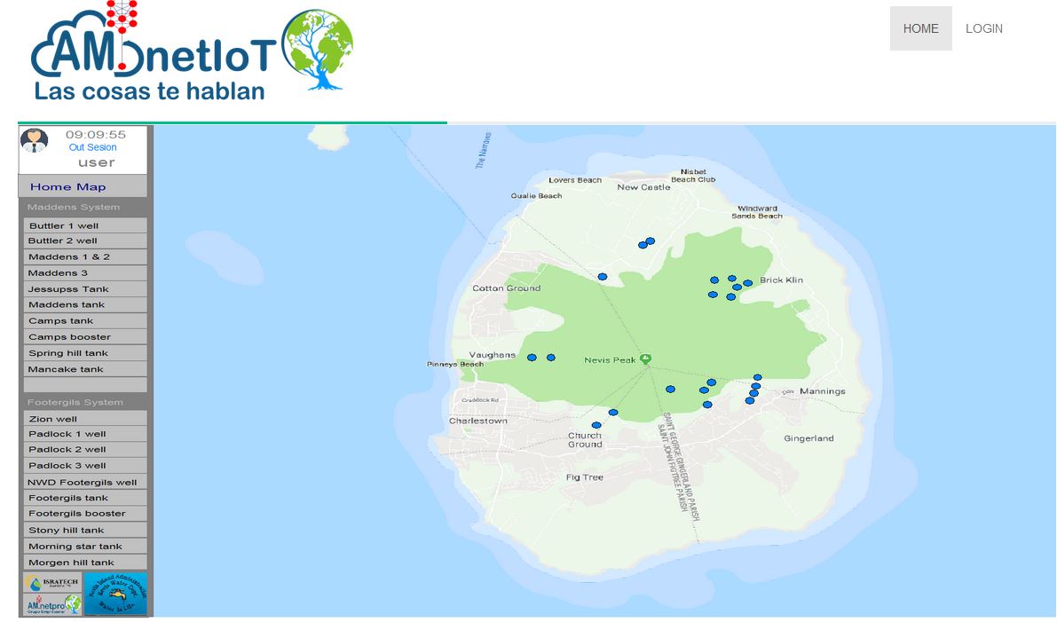 El proyecto de Nevis Water Department (NWD) es un sistema de SCADA que monitorea el sistema de agua en la isla Nieves en el Caribe. El sistema de acueducto de nieves se compone de dos redes, cada red empieza de los pozos que bombean el agua a un tanque buffer y de este tanque se eleva el agua por estación booster a un tanque de distribución. Este proyecto incluye el suministro y la instalación de instrumentos, paneles solares, automatización de todos los sitios en cada red y el servicio de SCADA en la nube. Al poner el proyecto en funcionamiento los algoritmos avanzados de AMnetpro encontraron fugas y la razón de una falla repetitiva que causo daños en una bomba de pozo, así que el retorno de inversión ha bajado de 3 años a solo 3 meses.